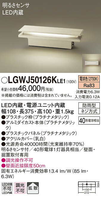 【最安値挑戦中!最大25倍】パナソニック LGWJ50126KLE1 門柱灯・門袖灯 壁直付型・据置取付型 LED(電球色) 拡散タイプ 防雨型・明るさセンサ付 パネル付型